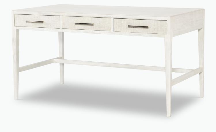 Finished in an off-white with raffia drawer fronts and polished nickel hardware