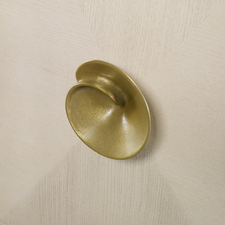 Oak solids and veneer with satin brass hardware and metal base. Behind each end door is one adjustable shelf. Behind two center doors are two drawers above one adjustable shelf. Tip restraint included