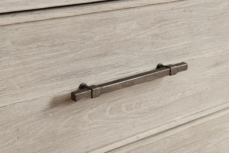 Two soft-close drawers with textured pewter metal base and hardware