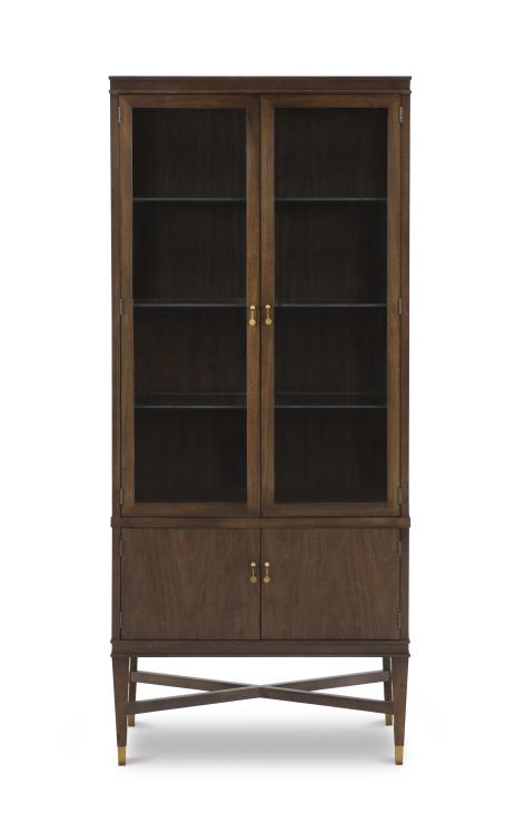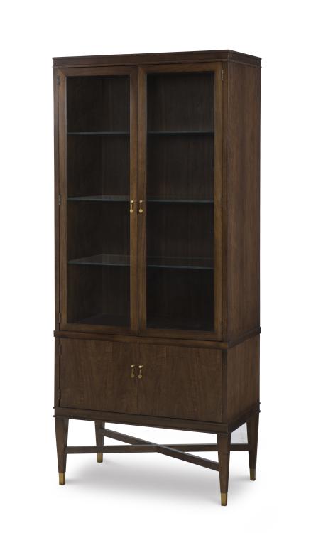 Behind two wood framed glass doors are three adjustable plate-grooved glass shelves, LED touch dimmer interior lighting above two doors with open storage behind