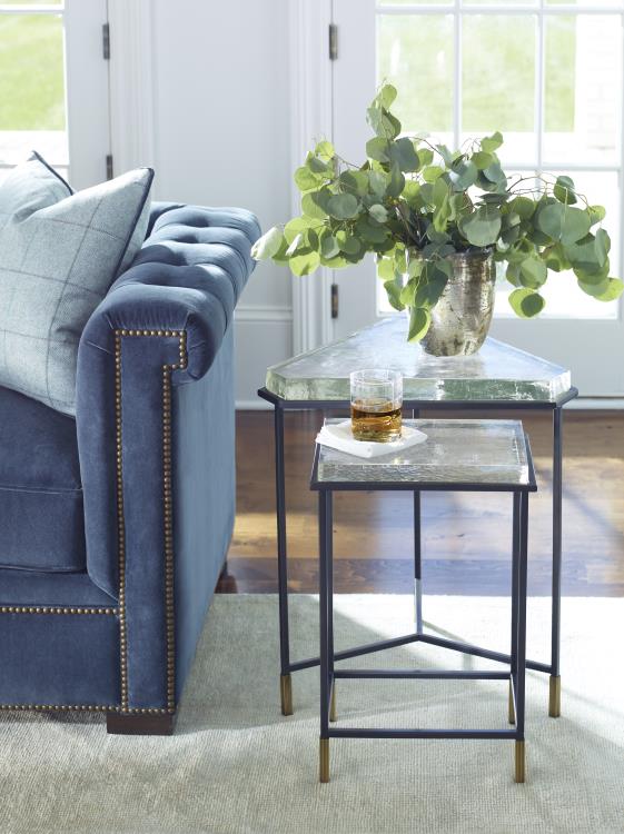 1.25" - 1.5" thick cast glass top on bronze finish metal base with brass ferrule feet