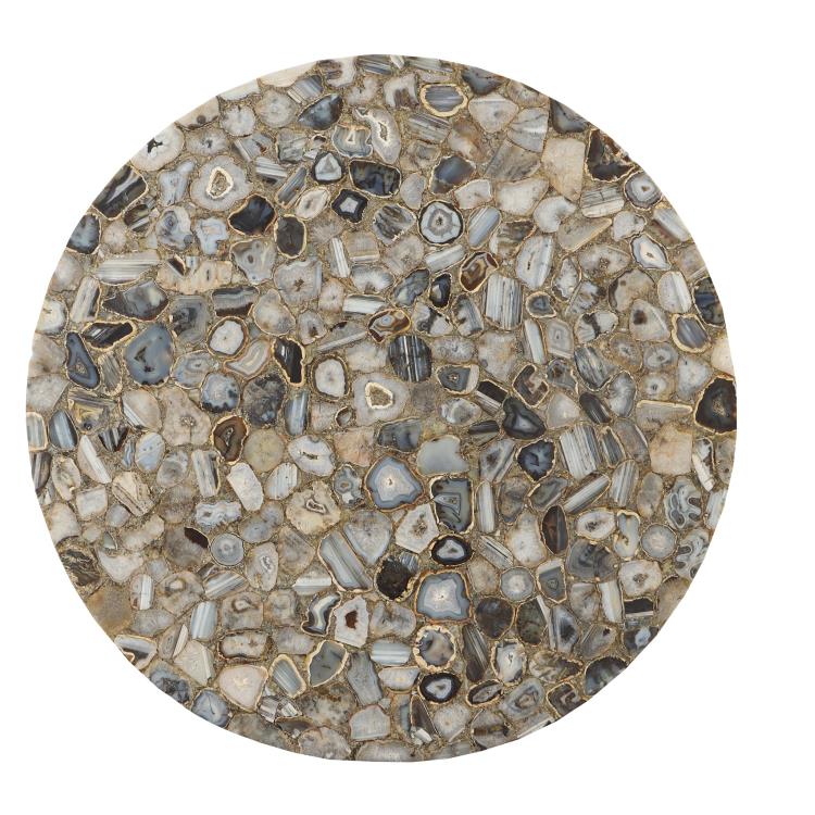Polished Black Agate stone top shines against the cladded Antique Satin Brass base, fitting for a dining table or a statement center table piece.