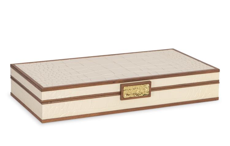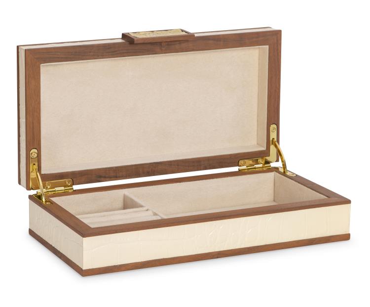 Set of three cream croc leather and walnut stacking boxes. The top two boxes have felt-lined compartments for jewelry or other small mementos. The bottom box is open for larger personal items. Textured brass handle