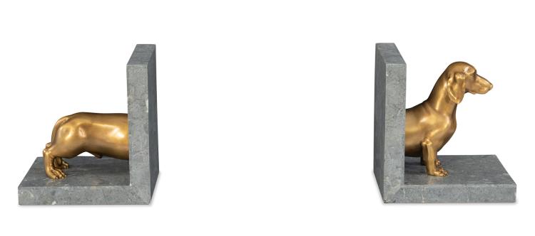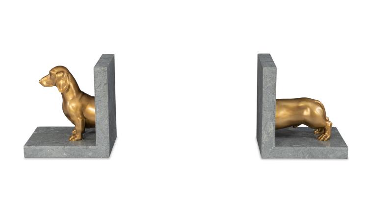 Dachshund Bookend sculpture in solid cast brass with a dark grey stone base.