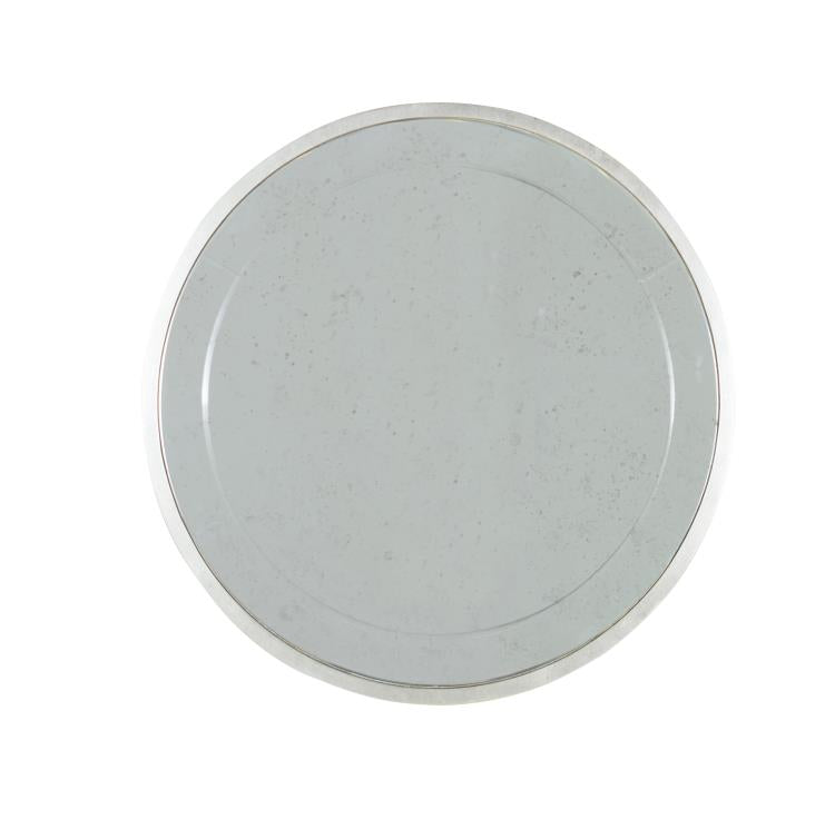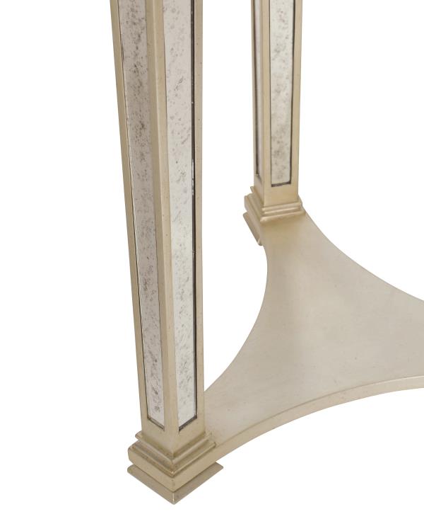 Finished in Palais silver leaf with antique mirrored top and accent panels down each leg