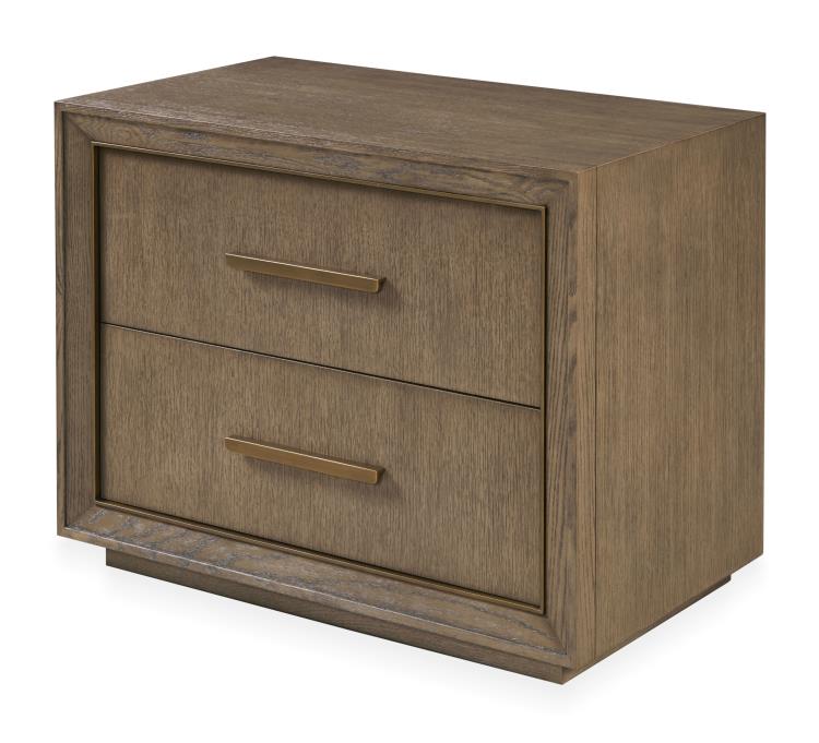 Camino Grey finish on Oak solids and veneer with Satin Gold finish metal trim. Two drawers with Satin Gold finish hardware