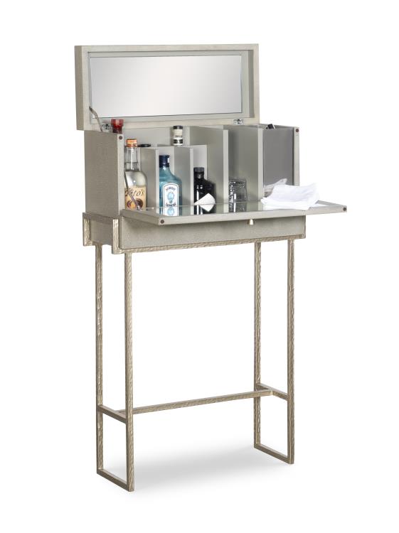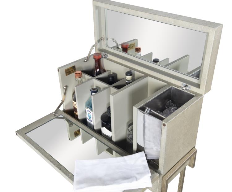 Light olive faux shagreen embossed leather with Champagne finish metal base & hardware. Flip top with mirror in top, six bottle compartments, ice bucket and drop-front with mirror serving tray