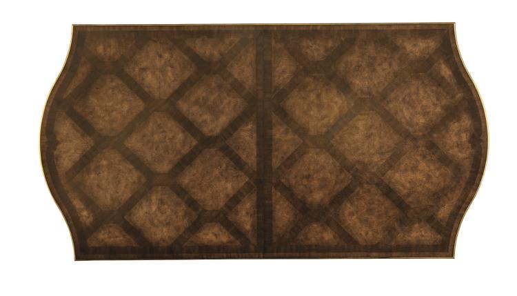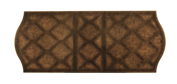 Mahogany Wood dining table, finished in Briar, is wrapped in a woven link parquet White Ash Veneer tabletop pattern. Handmade Carvings on legs and rail are trimmed in gilded Venetian Gold. Overall measurements include removable 23" table leaf.