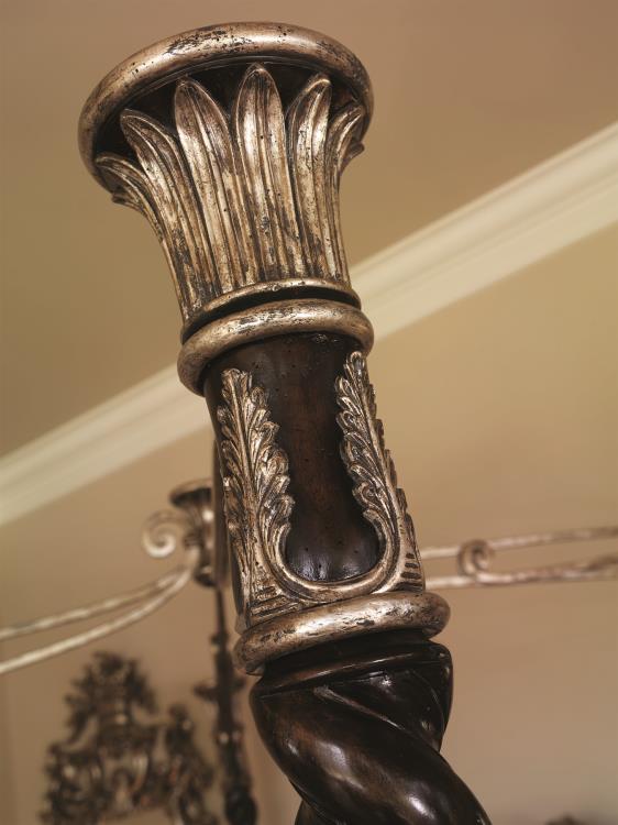 Old World Orleans poster bed with hand carved and gilded trim in Versailles. Iron canopy in Versailles, featuring upholstered Diamond Tufted Headboard with stitched buttons in Glaze Copper fabric.