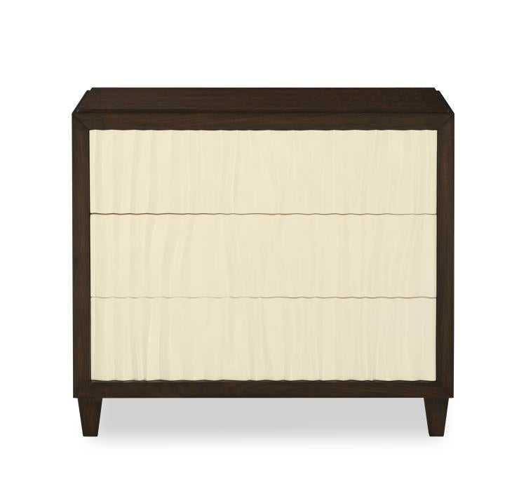 Three push-latch soft-close drawers with Cameo finish fiberglass fronts. USB outlet on back of case