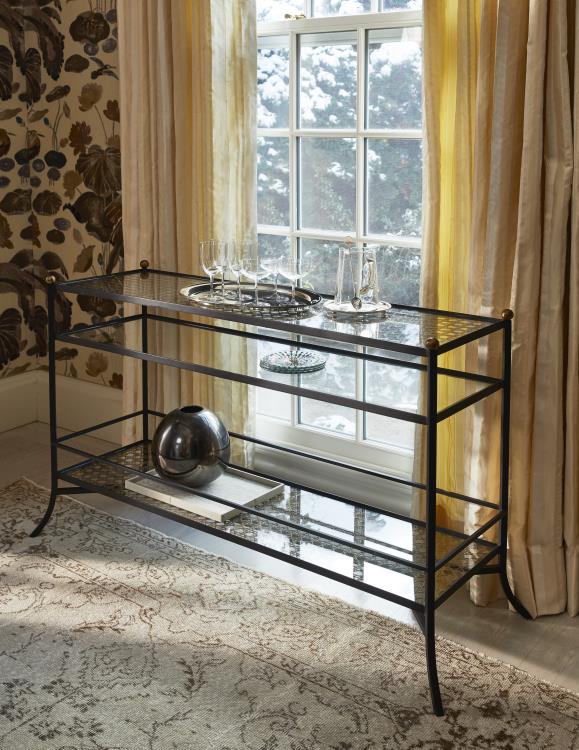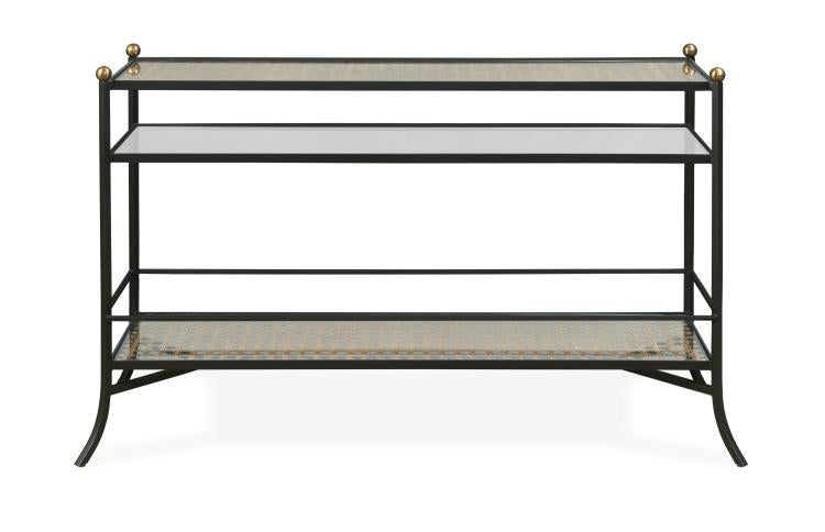 Rustic black finish steel with brass finish finials. Woven rattan cane trim under tempered glass top & shelf